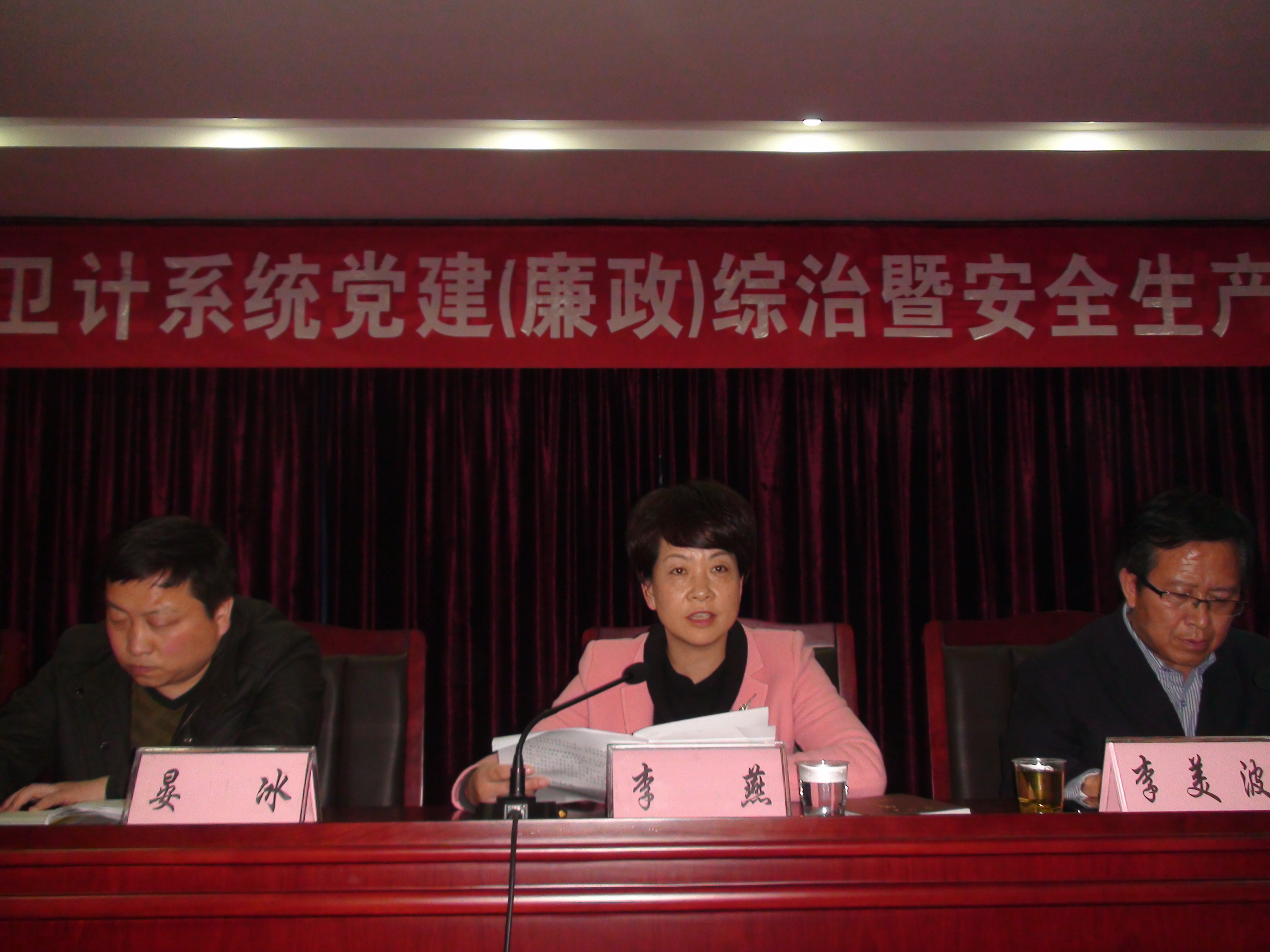 李燕同志指出,党建工作重点抓好三个方面,一是要抓观念转变,进一步提高抓基层党建的认识。二是要抓基层基础,进一步突出抓党建工作的核心。重点做到“四个强化”:一要强化班子建设;二要强化基本队伍建设,突出抓好后进党组织排查整顿、党风廉政教育和抓好“关键少数”,着力发挥党组织的领导核心作用;三要强化党内制度落实,使党内政治生活更加灵活、更加生动、更富成效;四要强化党建载体落实,主要做好“三联一创”深化活动、精准扶贫、脱贫和“双十星”争创活动。三是要抓工作措施,进一步推动党建任务落实。一要压实责任抓落实,二要强化管理抓落实,三要从严问责抓落实。在推进党风廉政和纠风工作中,她要求卫计系统做到“五个到位”:把全面从严治党要求落实到位,把党风廉政建设工作推进到位,把严明政治纪律、规矩和依法管理执行到位,把“四风”问题坚决整治到位,把《准则》和《条例》传达贯彻到位。在落实综治维稳工作方面,她强调一要落实责任,着力完善信访维稳工作机制。重点做好“五个加强”:加强医疗安全和医疗质量的提高,加强矛盾纠纷排查调处,加强苗头严防、过程严管、违纪严惩,加强来信来访的认真办理,加强医疗信访责任的追究;二要整合资源,着力增强治安防控能力;三要严格制度,确保禁毒工作和反邪教工作有效开展;四要强化领导,着力夯实工作基础。在加强安全生产工作方面,她指出一要充分认识卫计系统安全生产面临的形势;二要切实保障卫计系统安全生产无差错,切实做到“五提高”:提高全员安全工作意识和责任,提高安全生产工作的领导责任,要提高医疗安全保障措施,提高突发事件医疗救治工作能力,提高安全应急演练和教育培训工作力度。
