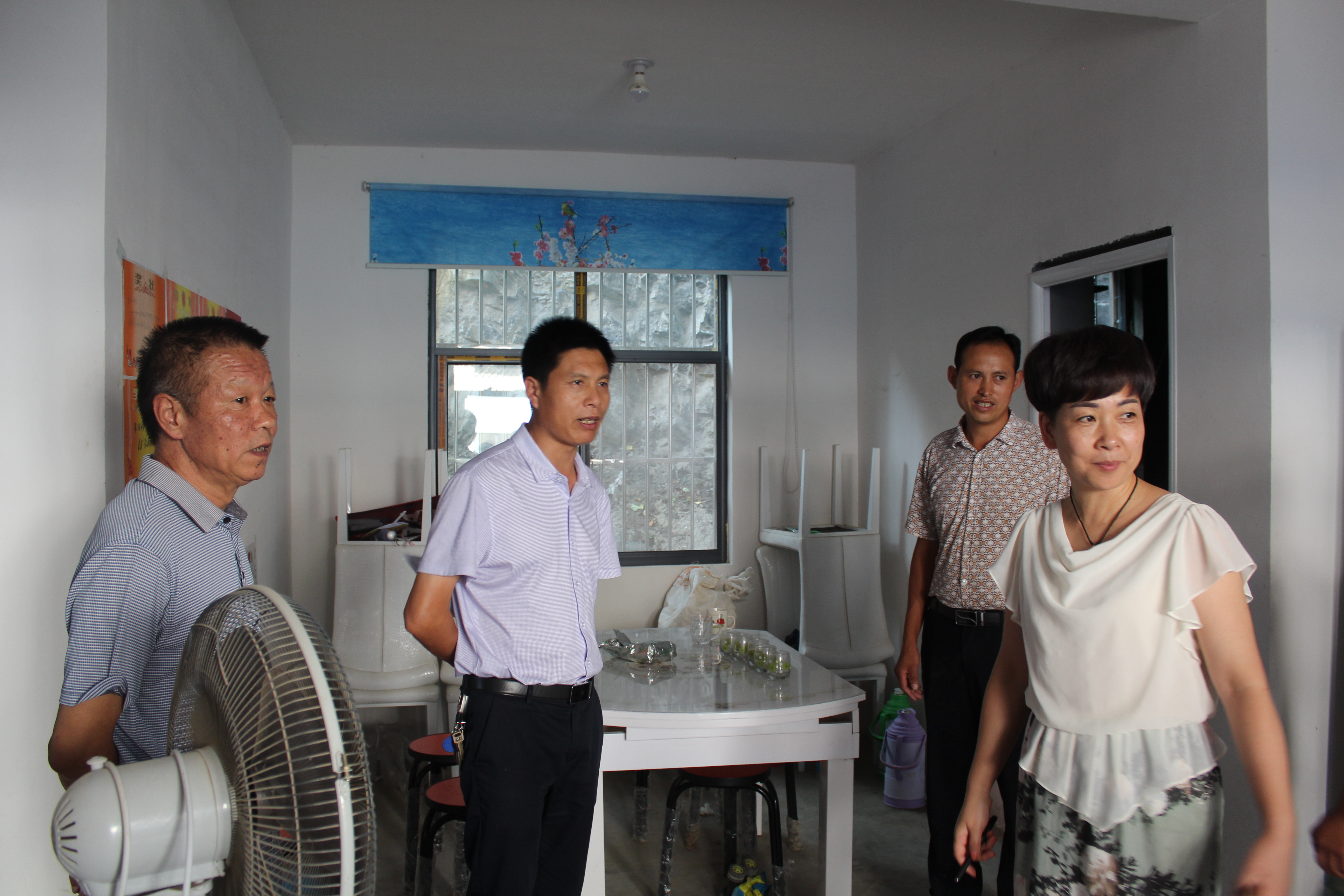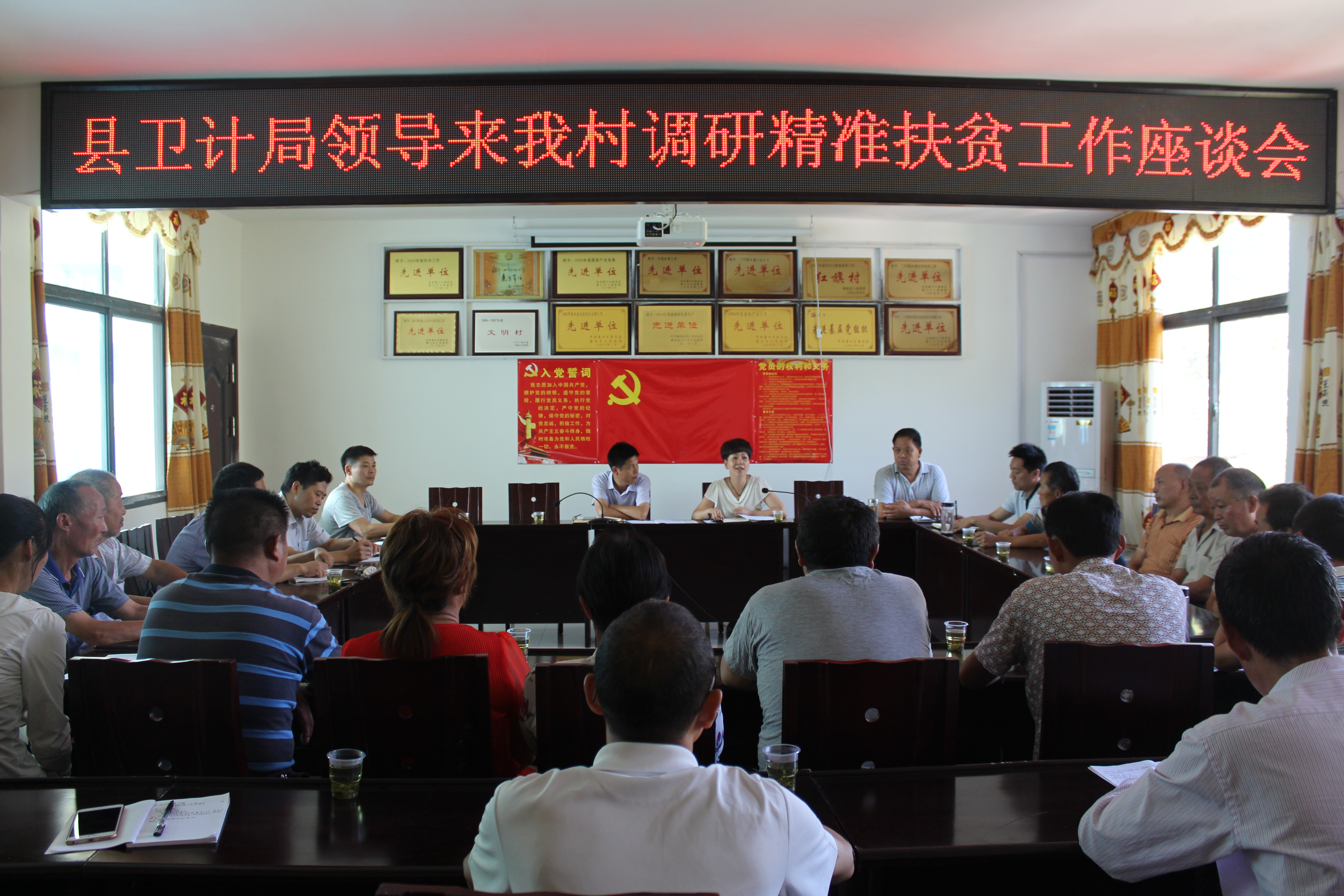 8月16日下午,卫计局局长李燕来到香口乡孟川村就精准扶贫工作进行专题调研。她下午2点从局里出发,不到3.30时就来到村委会,村委会的会议室里已经整整齐齐坐了近20名群众代表,他们当中有党员代表、贫困户代表和非贫困户代表,乡长高兰品陪同调研。