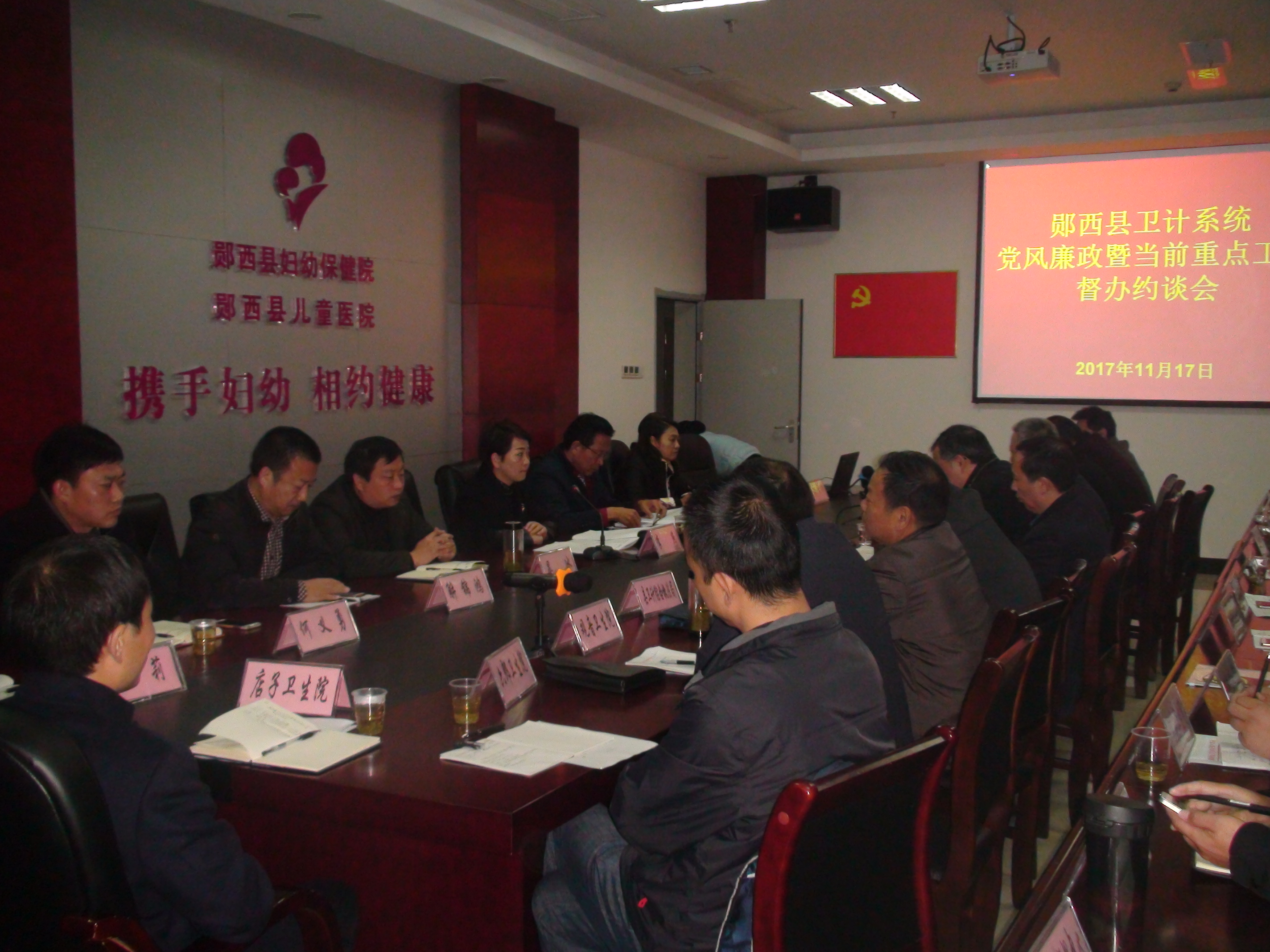 11月17日,郧西县卫计系统党风廉政暨重点工作督办约谈会在县妇幼保健院15楼小会议室召开,对党风廉政主体责任、医疗费用控制、健康扶贫政策落实等工作存在问题的三家单位主要负责人进行约谈,局班子全体成员、乡镇卫生院长、县直医疗机构负责人参加会议。