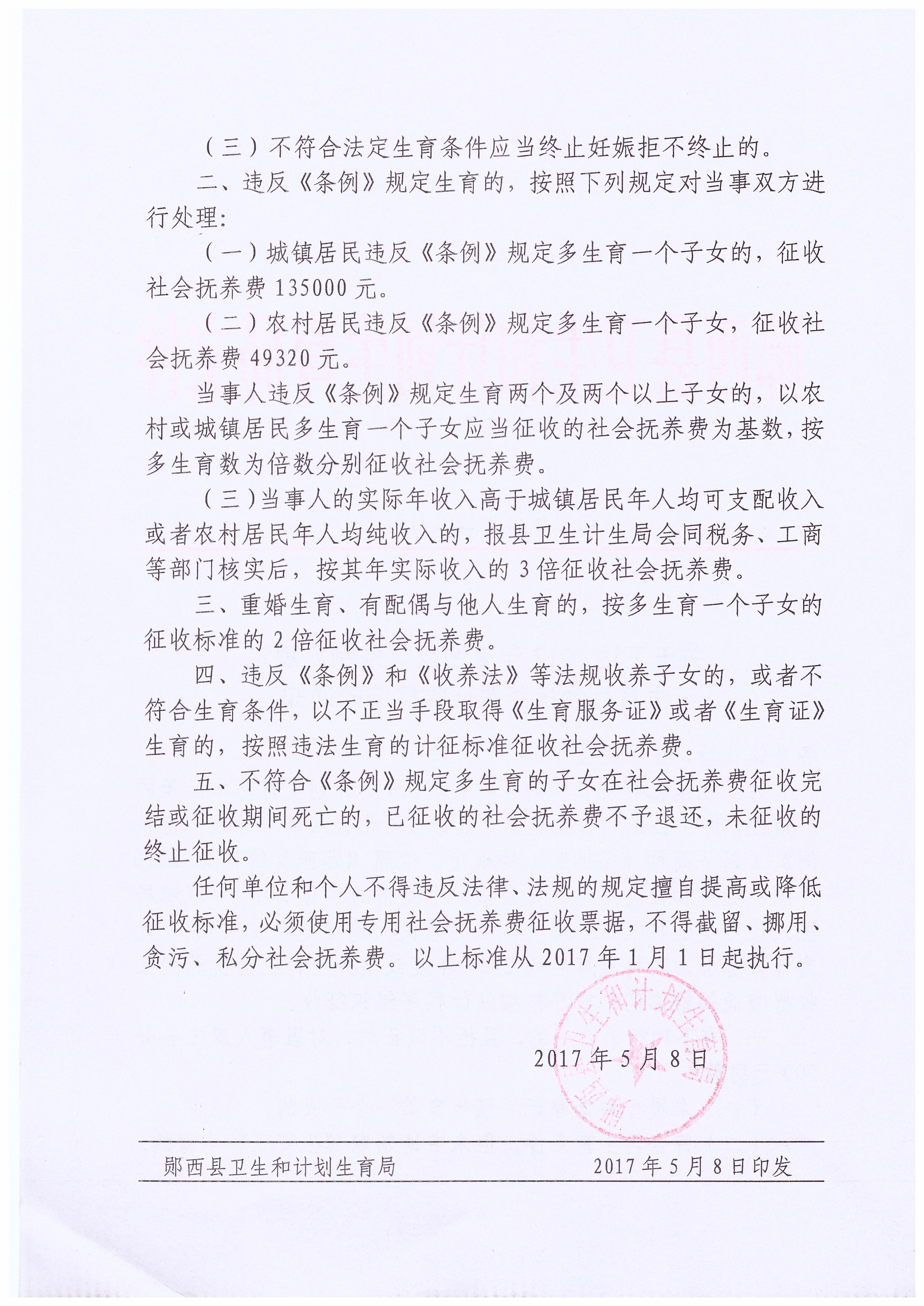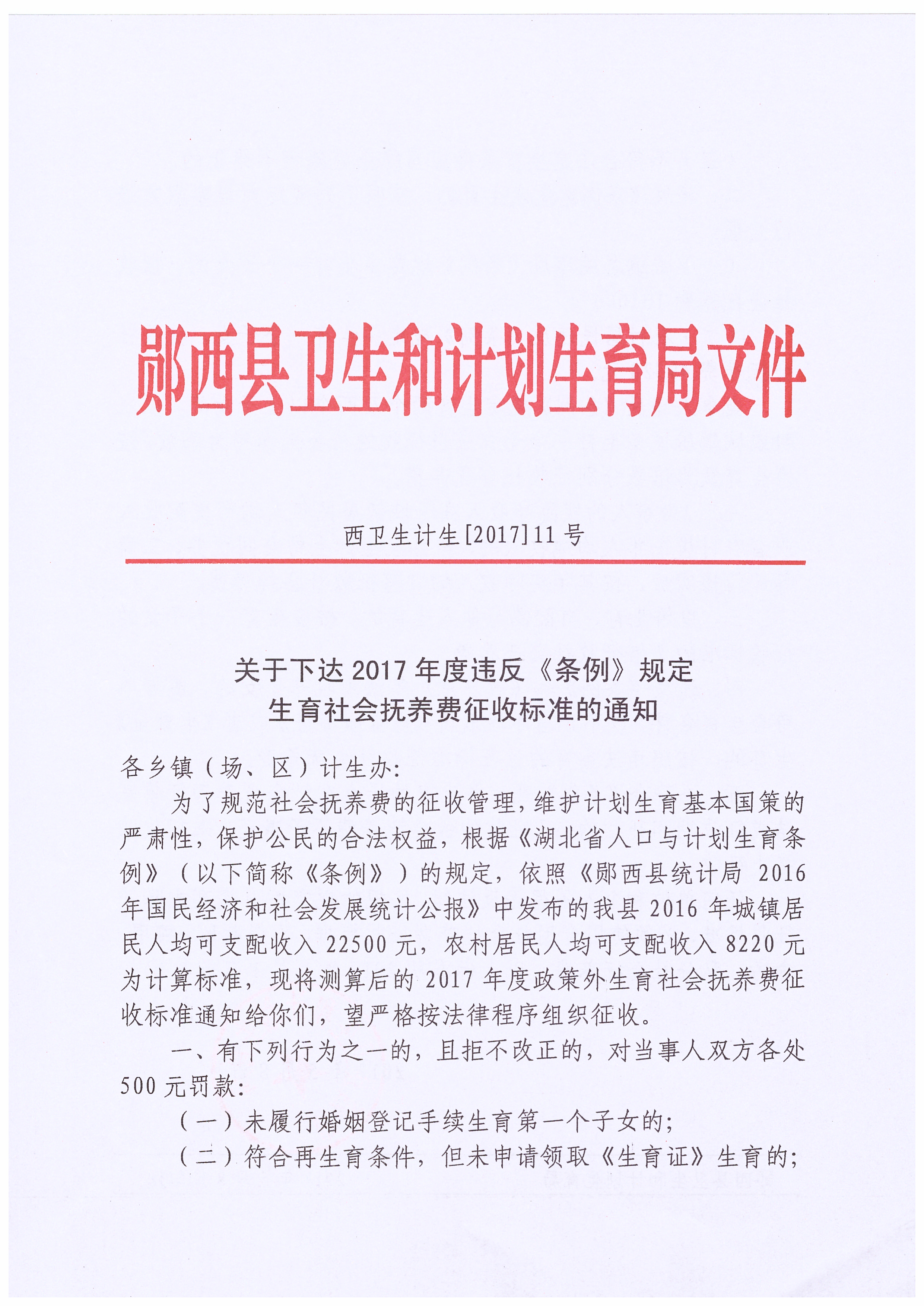 2017年度违反《条例》规定生育社会抚养费征收标准的通知